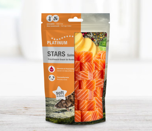 Platinum STARS Salmon je svačinka pro psy připravená z čerstvého masa – ideální pro výcvik i za odměnu