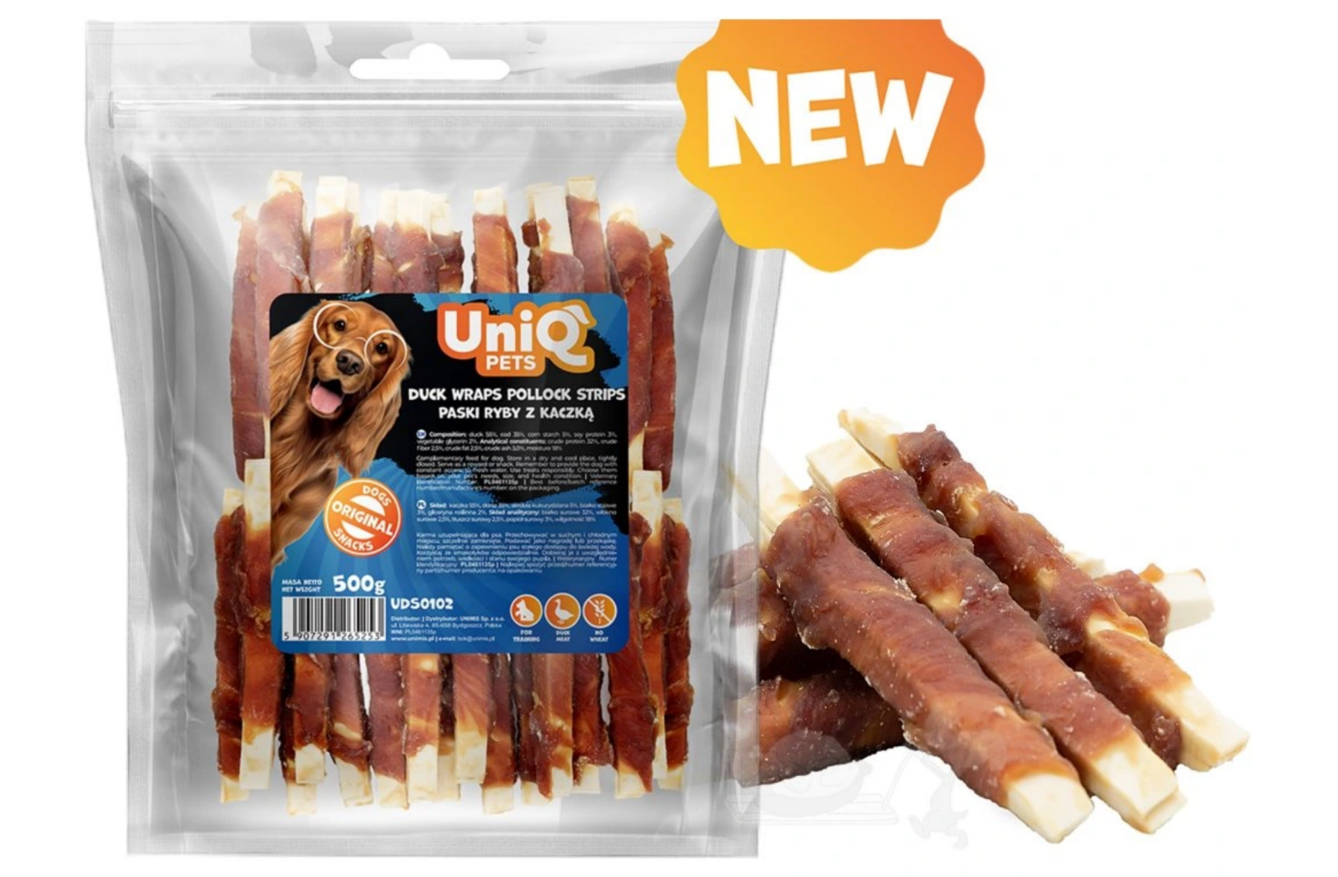 Složení: Kachna 55 %, treska 35 %, kukuřičný škrob 5 %, sójová bílkovina 3 %, rostlinný glycerin 2 %