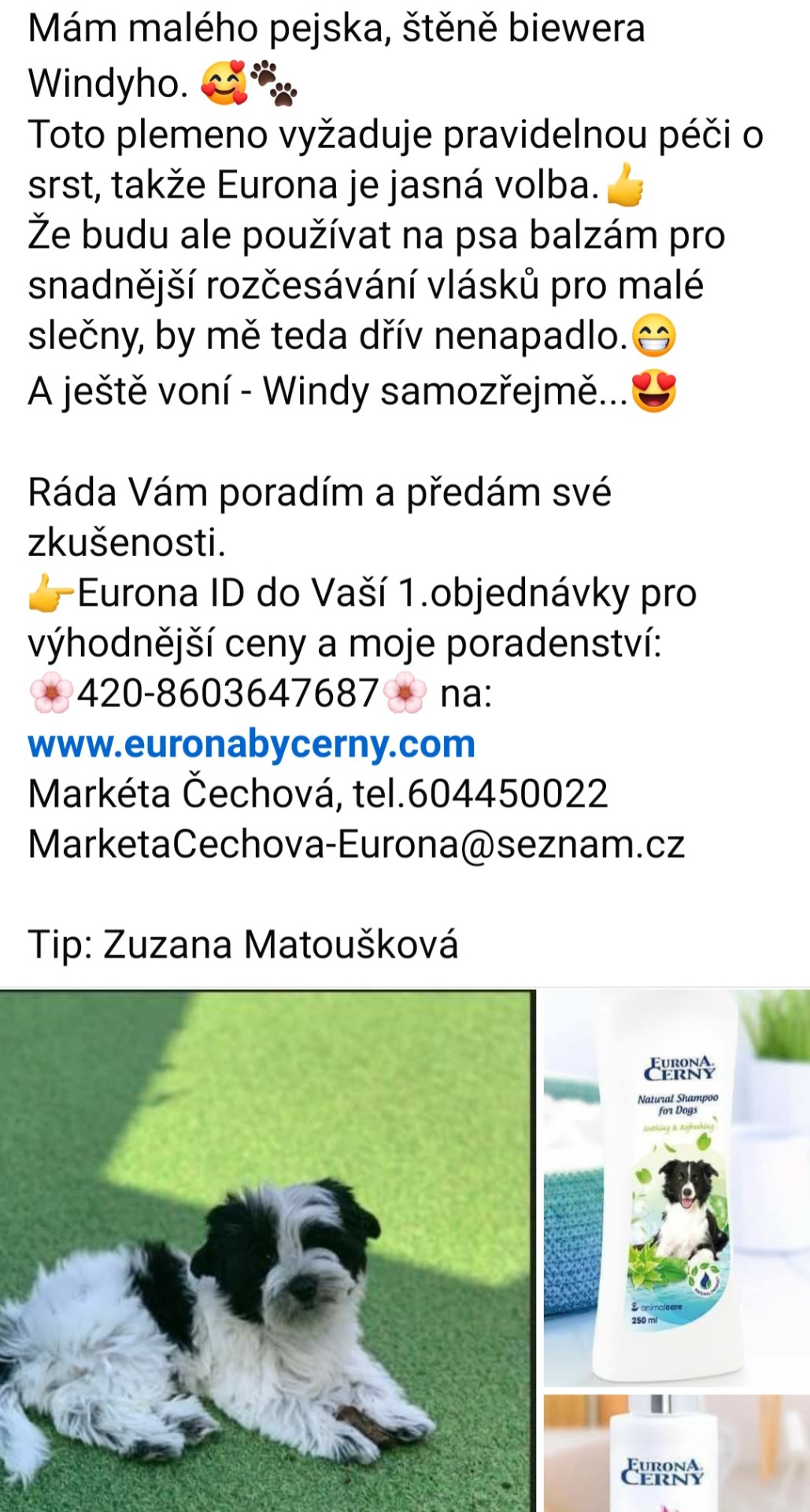 Doporučuji nejen pro pejsky, ale i pro štěňátka a kočičky - obsahuje výhradně přírodní složky, šampon je hypoalergenní, dobře smyje všechny nečistoty ze srsti i tlapek a jako bonus příjemně provoní srst zvířátka meduňkou a mátou