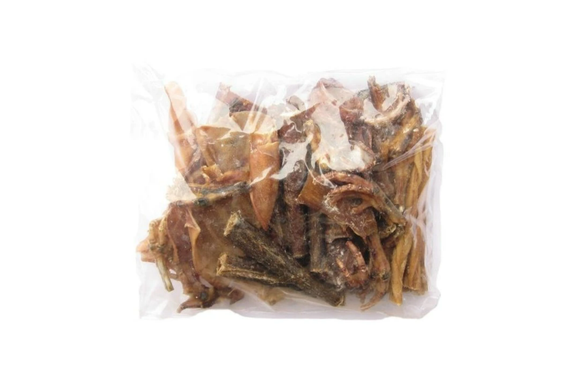Směs různých sušených pamlsků - ucho, pařátek copánek, penis, sušená střívka, vnitřnosti a jiné žvýkací pamlsky