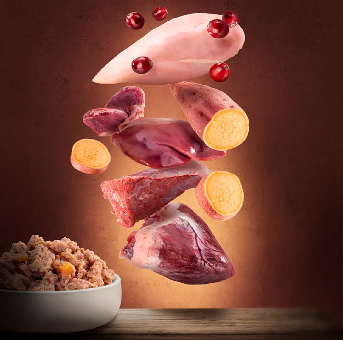 45 % kuřecí filet, 28,8 % vývar, 10 % krůtí (játra, žaludky), 5 % hovězí Black Angus (plíce, srdce), 5 % kuřecí tuk, 3 % batáty, 2 % brusinky, 1 % minerální látky, 0,2 % lososový olej