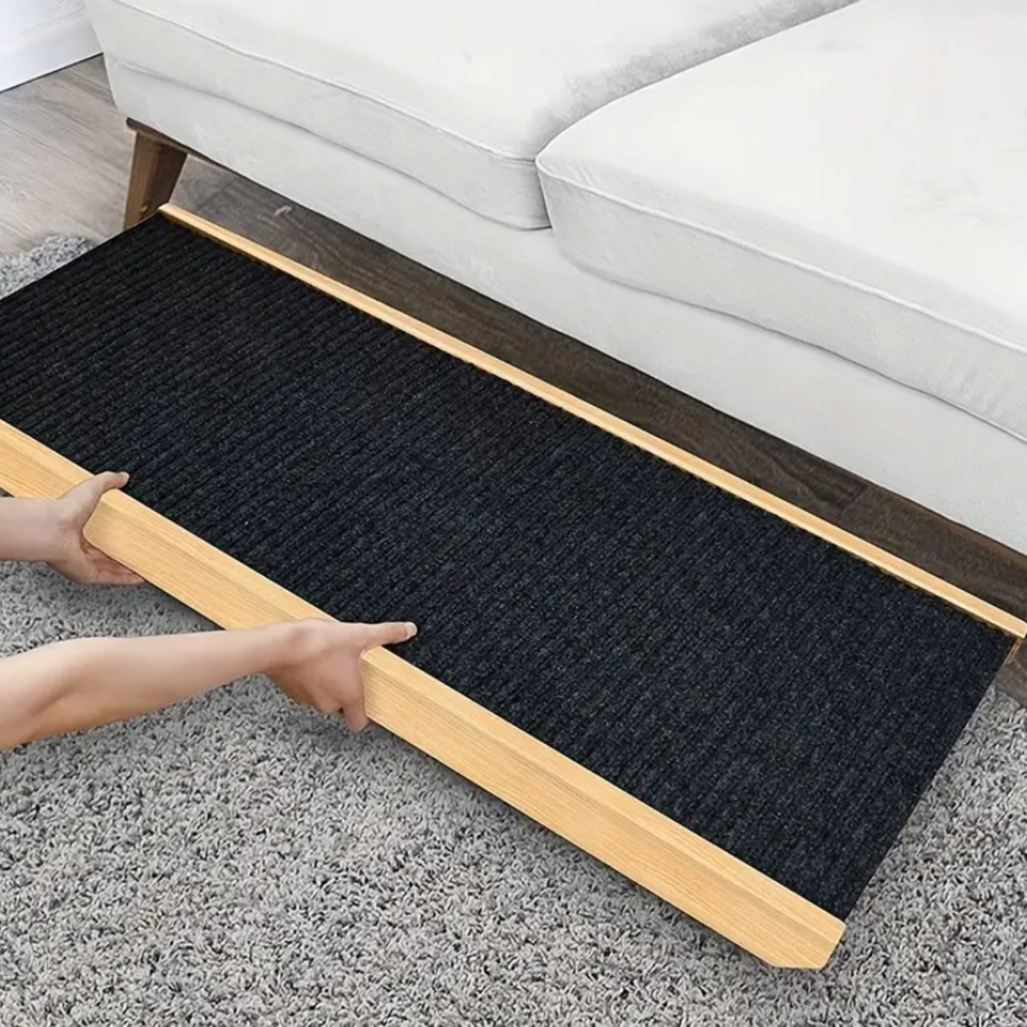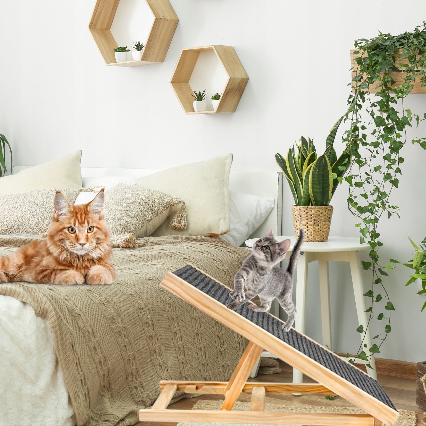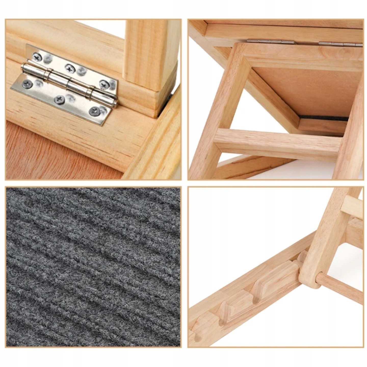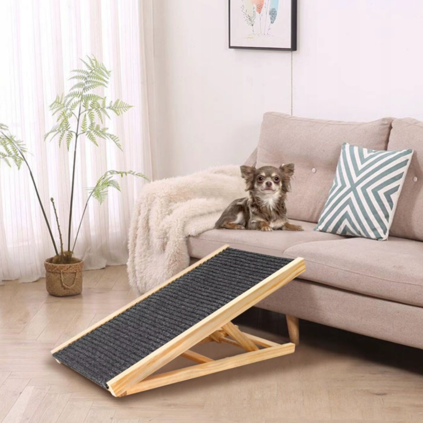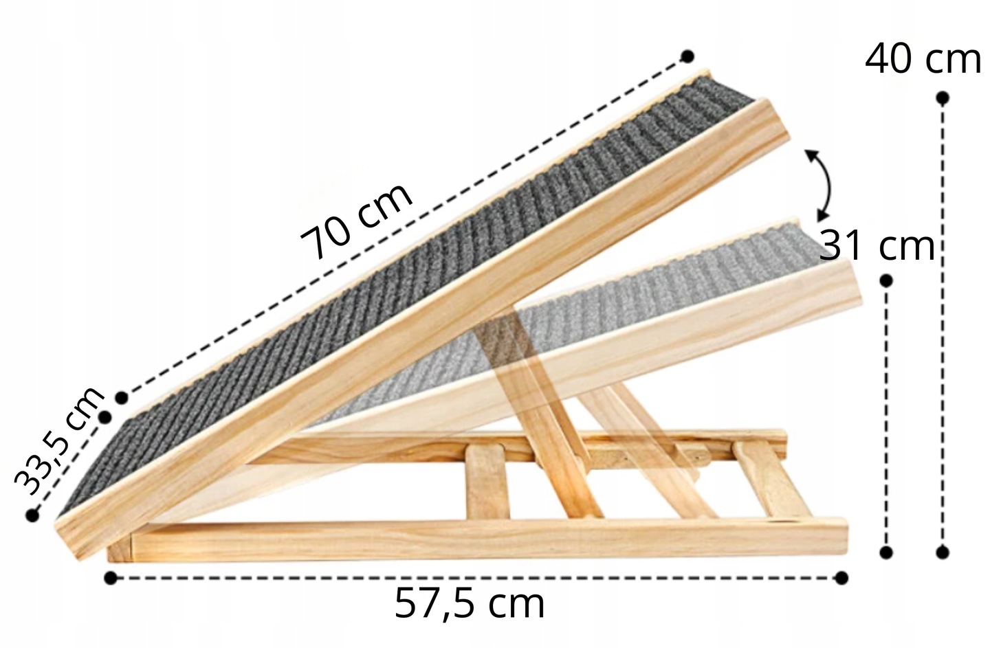 Funkční rampa pro psy, která usnadňuje domácím mazlíčkům přístup k nábytku, jako jsou pohovky nebo postele. Díky stabilní dřevěné konstrukci a protiskluzovému povrchu je bezpečné a pohodlné používání. Rampa má nastavitelný úhel sklonu, což umožňuje její přizpůsobení různým výškám nábytku.