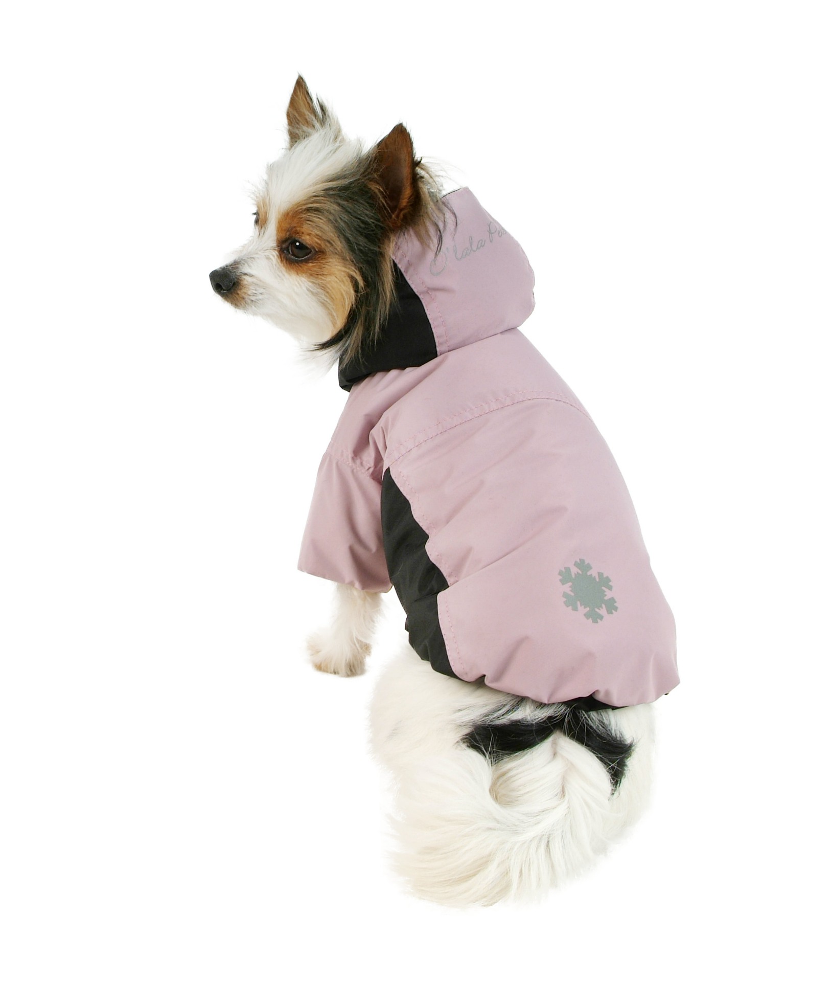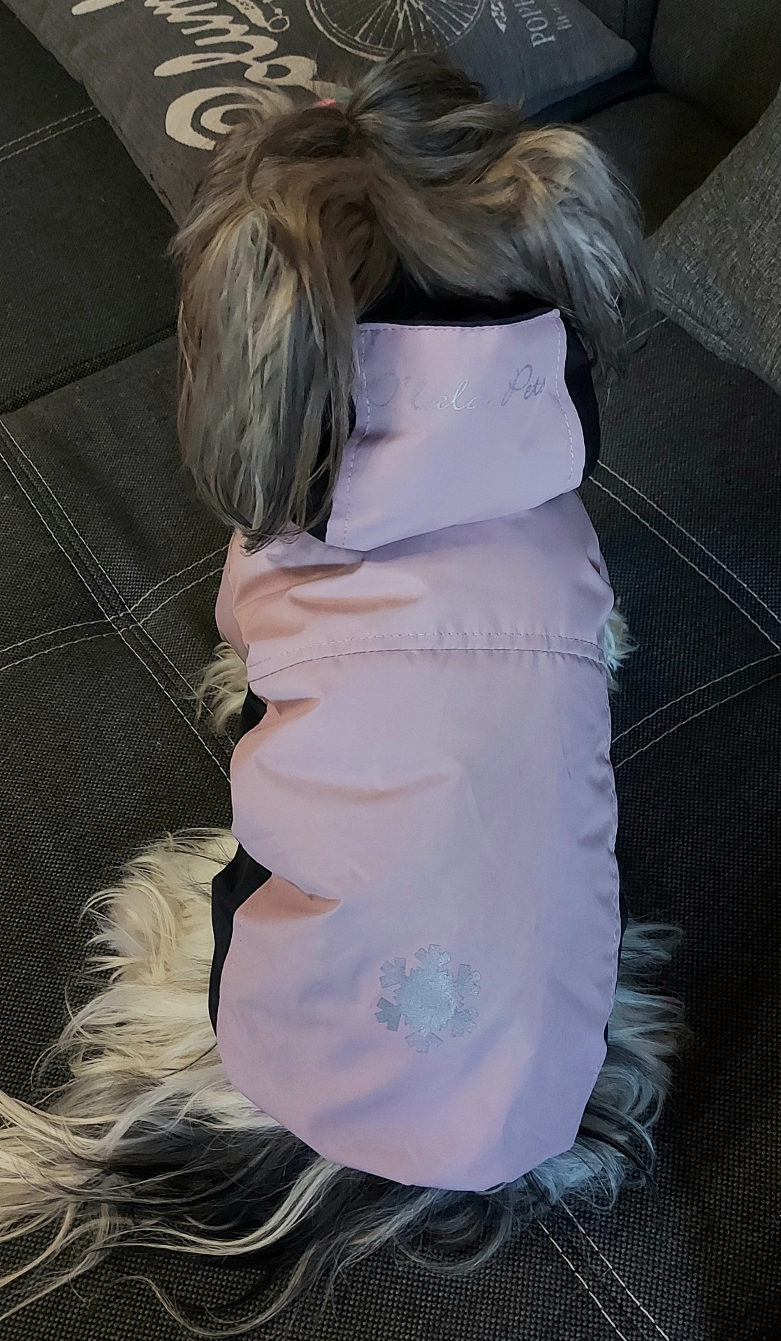 Na bundě na zádech je REFLEXNÍ výšivka vločky, na kapuci reflexní výšivka Ó lala Pets