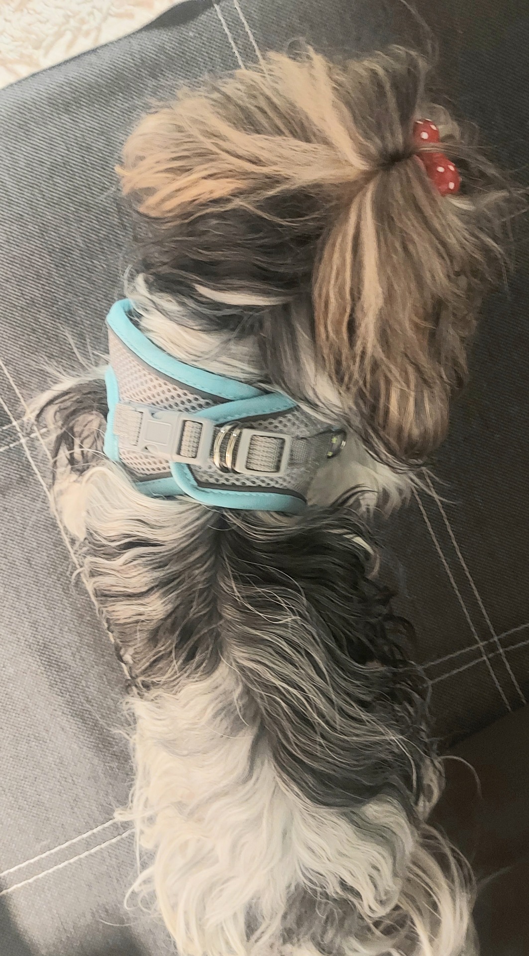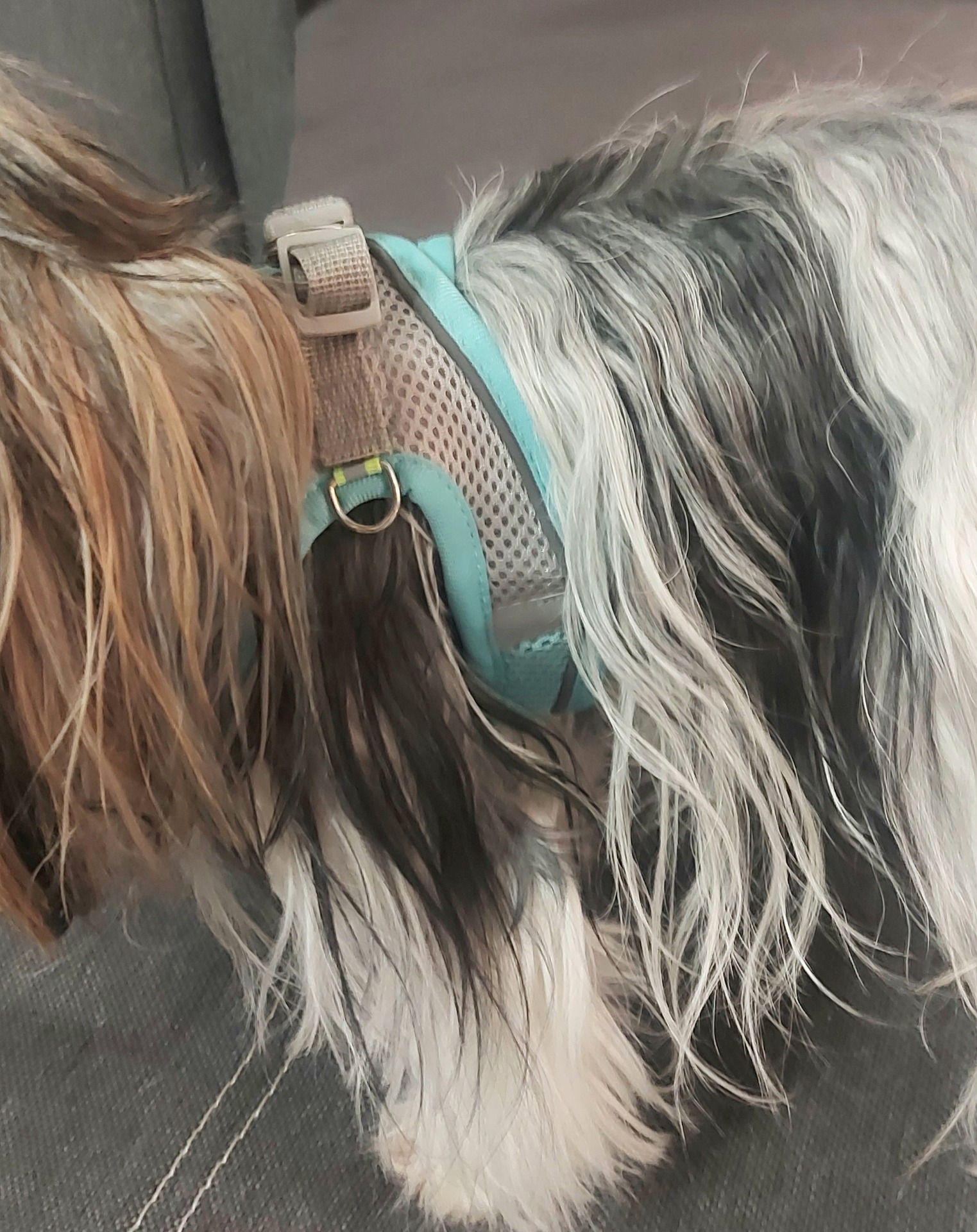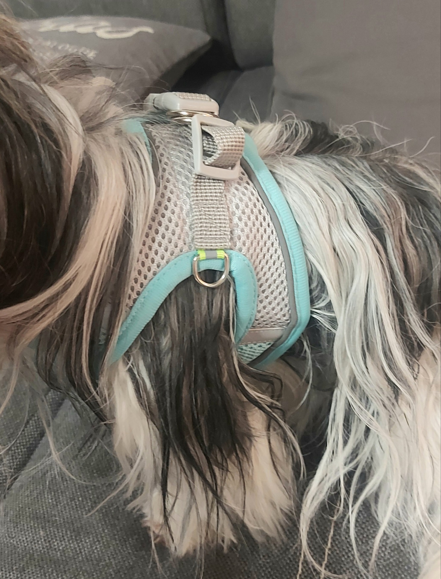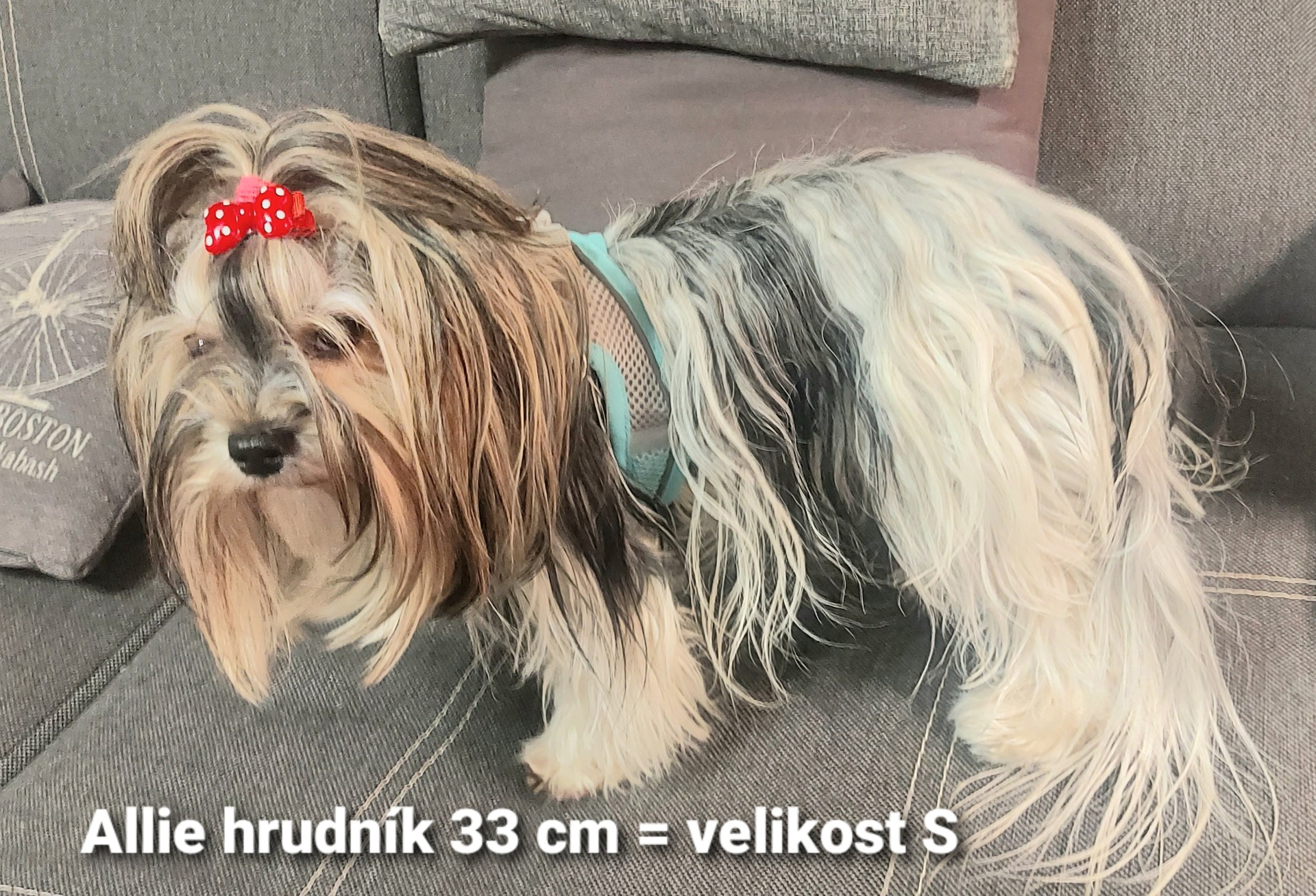 Postroj lze nosit i přes oblečení, velikost je nastavitelná, lze upravit dle potřeby pejska
