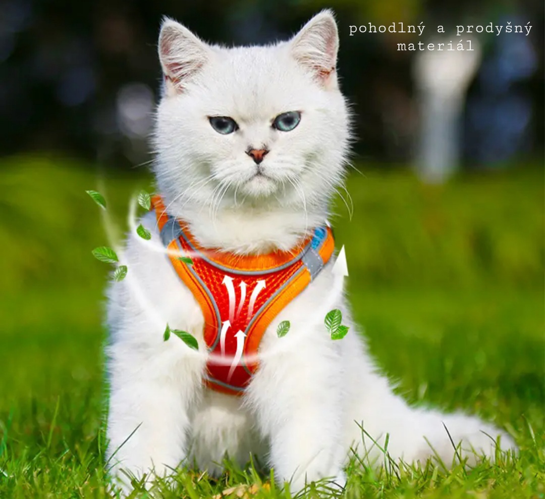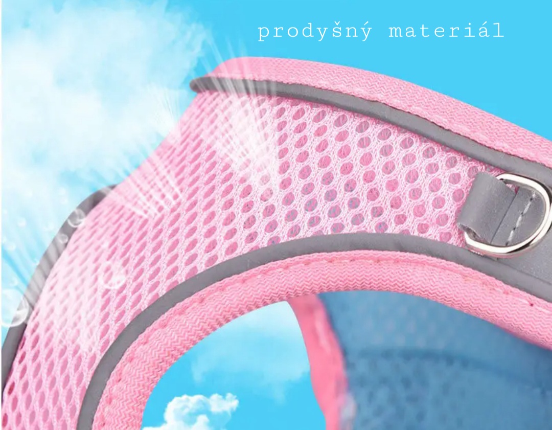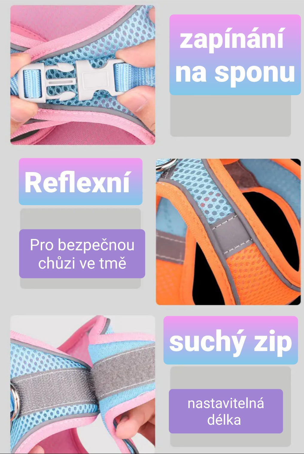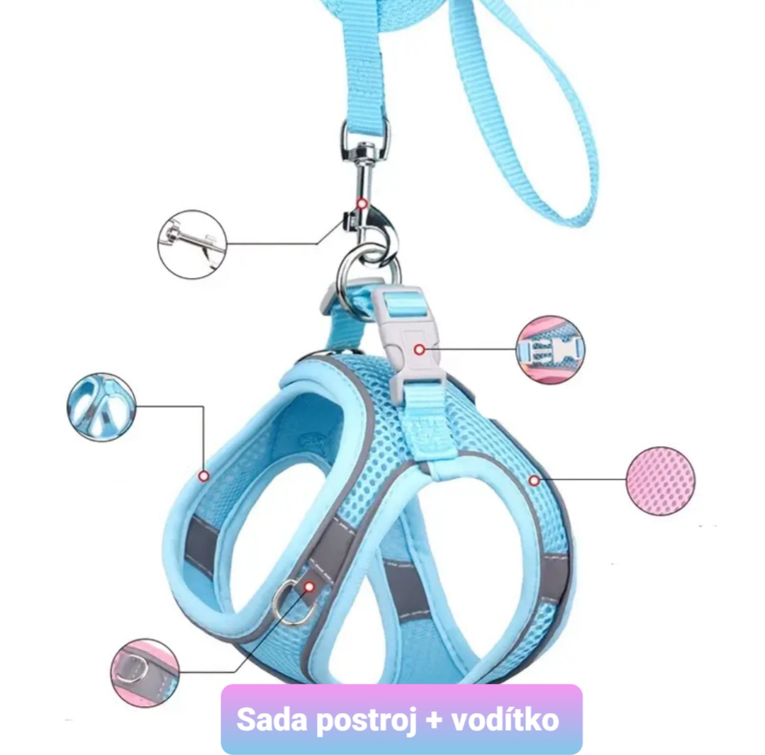 Prodyšný a pohodlný postroj s možností regulace délky včetně vodítka si jednoduše zamilujete