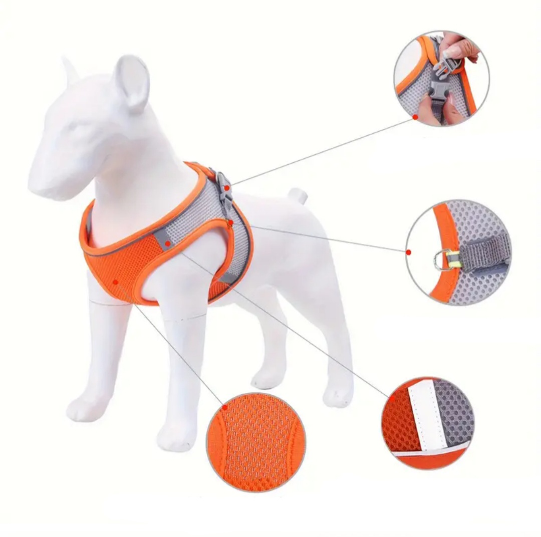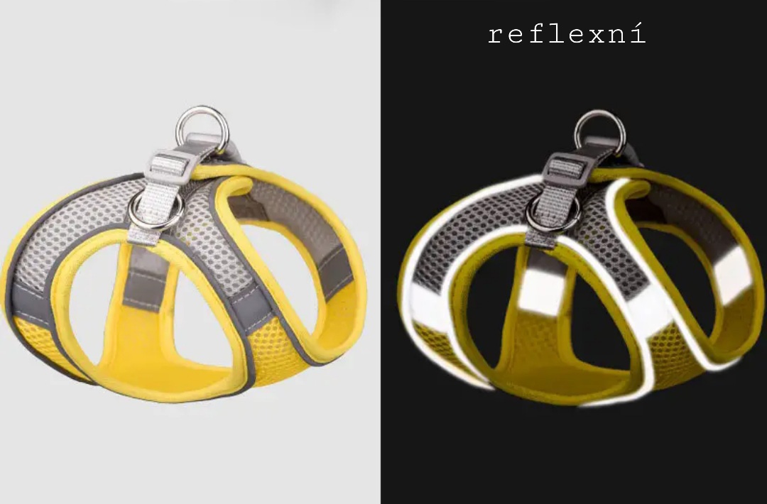 Po okrajích postroje se nachází pásky s reflexními prvky, které zvyšují viditelnost mazlíčků ve tmě