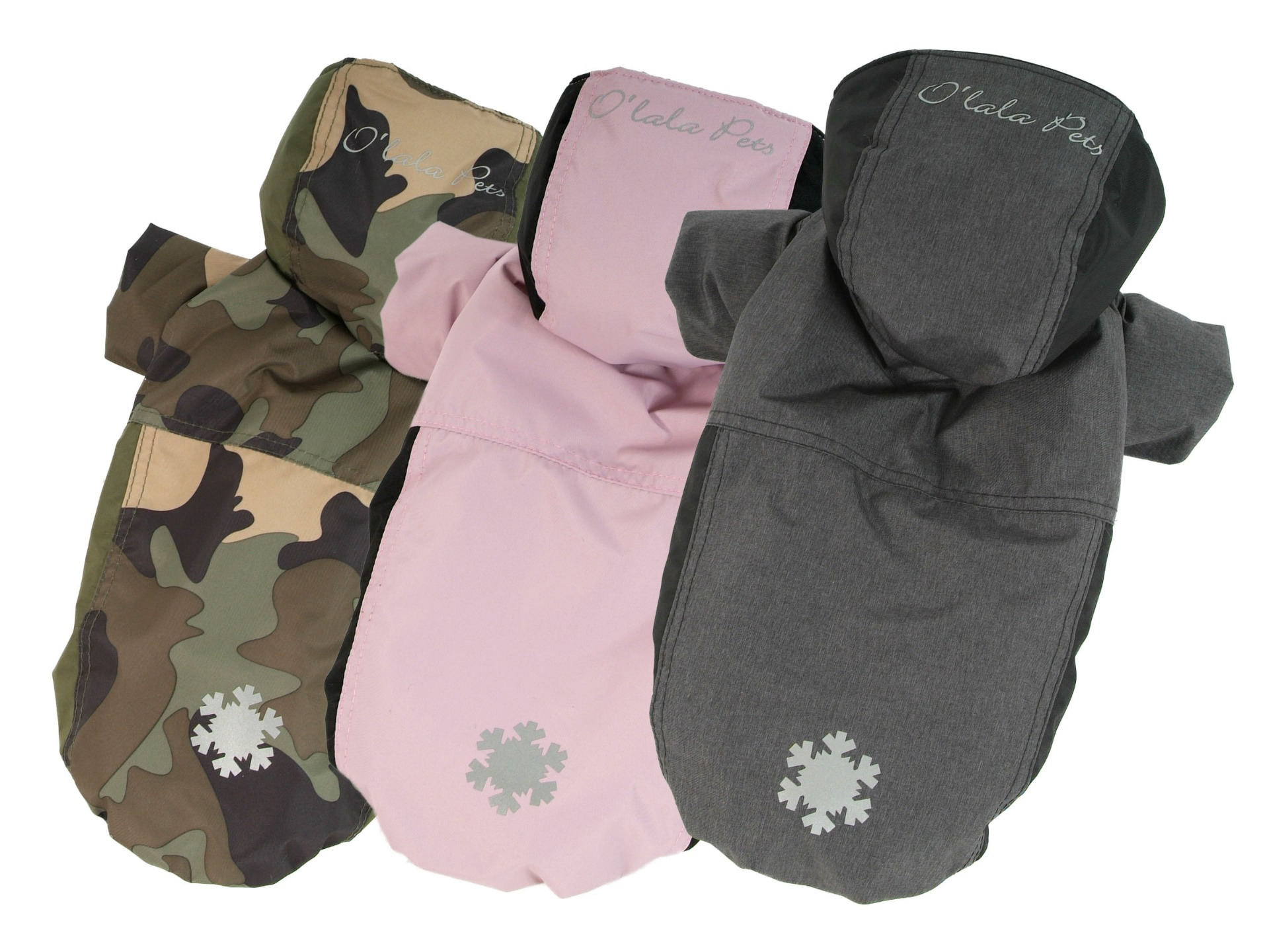 Na bundě na zádech je REFLEXNÍ výšivka vločky, na kapuci reflexní výšivka Ó lala Pets