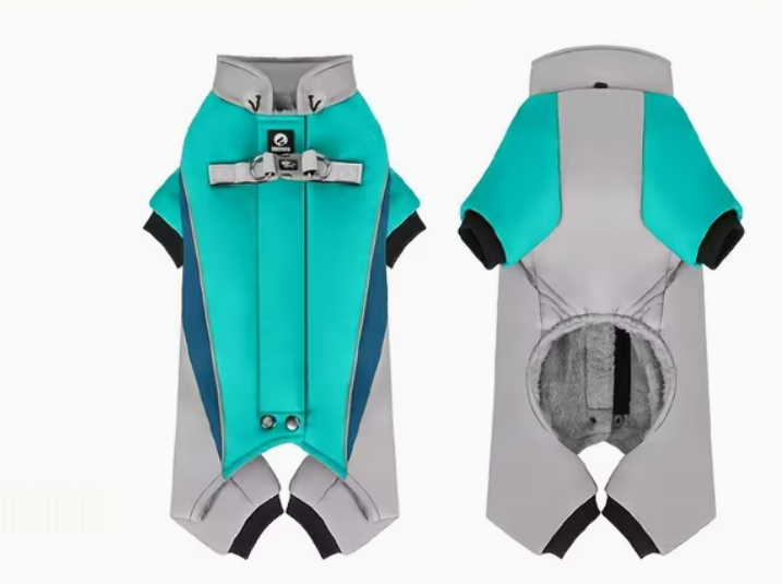 Kombinéza je nepromokavá, vhodná do mrazu, deště i mokrého sněhu, kryje všechny nohy psa