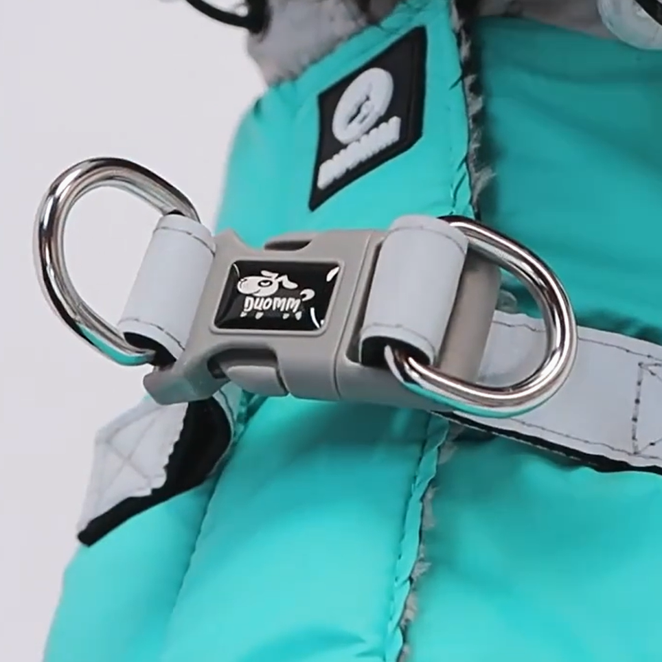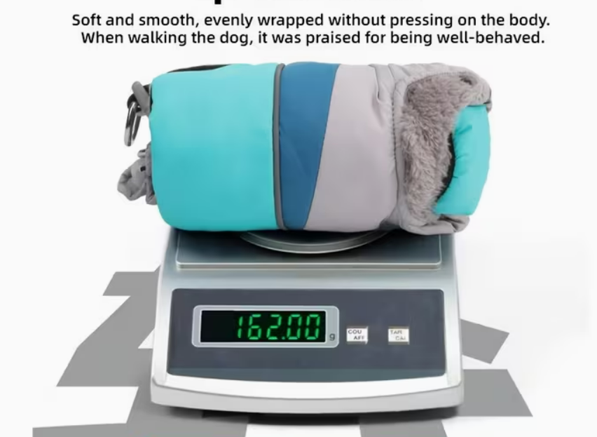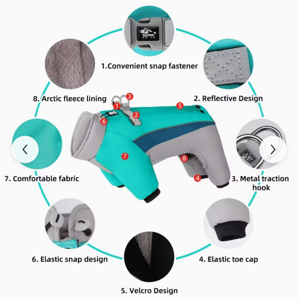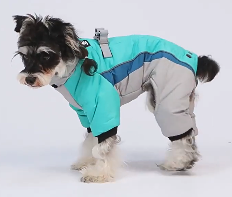 Kombinéza je nepromokavá, vhodná do mrazu, deště i mokrého sněhu, kryje všechny nohy psa