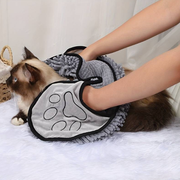 Rychle vysuší pejska, štěně i kočičku po koupeli, absorbuje velké množství vody, materiál je velmi příjemný na tělo zvířete