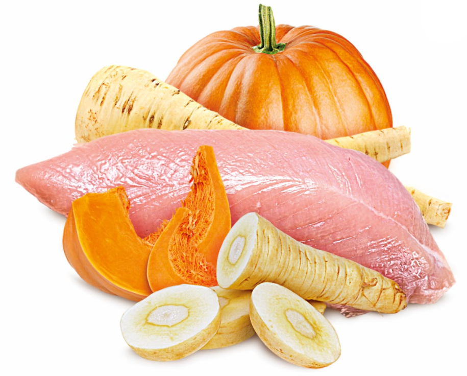dehydrované krůtí maso 35%, hrách 35%, batáty 14%, kuřecí tuk 7%, dýně 4%, sušená jablečná dřeň 4%, sušený pastiňák 1%