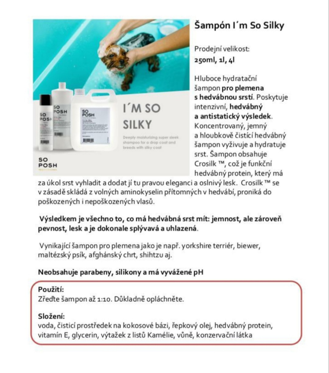 Nejprve aplikujte na vlhkou srst naředěný šampon So Posh I'm So Silky - řeďte v poměru 1:10 (1 díl šamponu + 10 dílů teplé vody), vetřete naředěný šampon So Posh I'm So Silky do srsti, opláchněte a postup opakujte, důkladně srst pejskovi umyjte teplou vodou