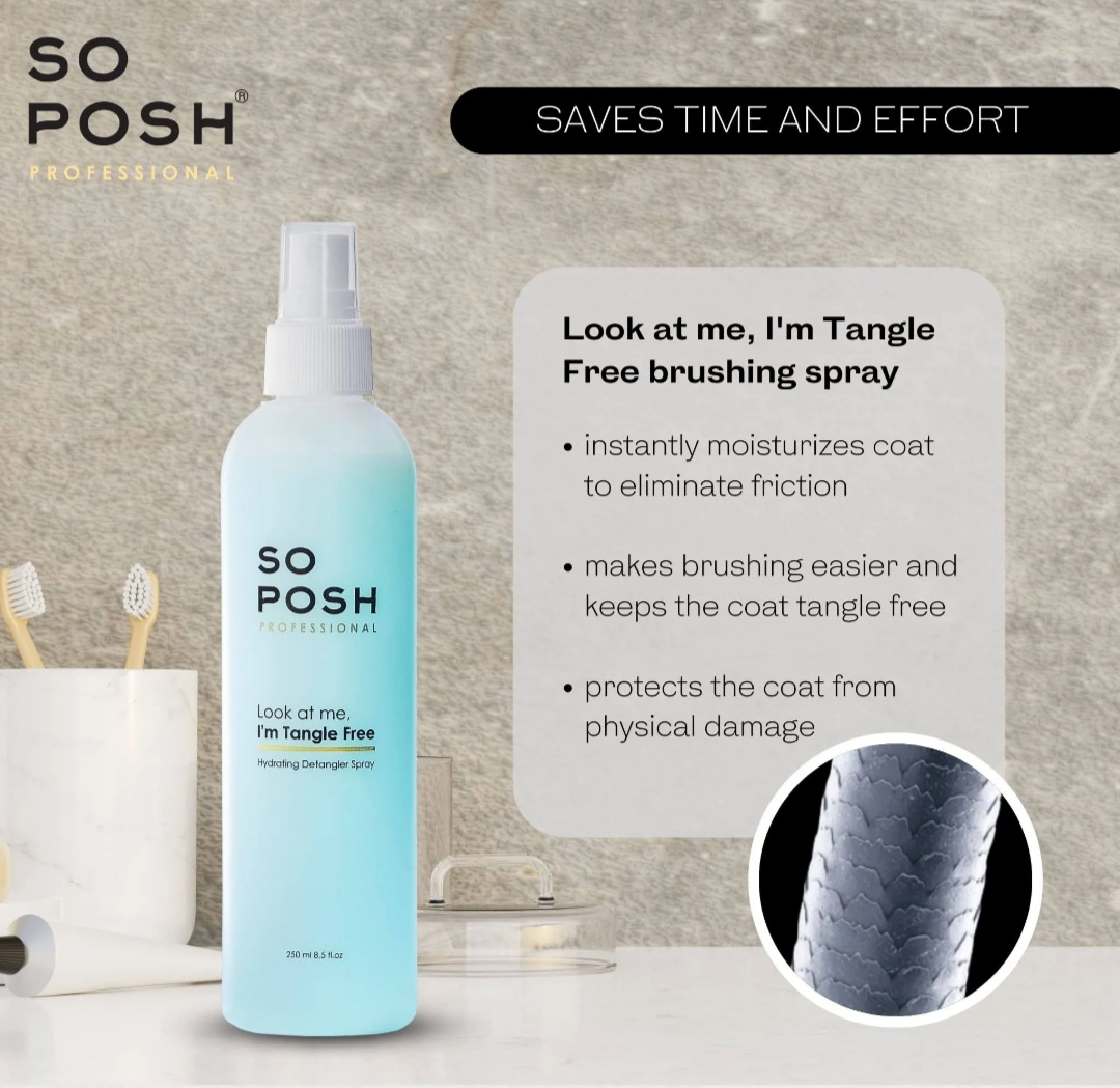Pro konečnou úpravu srsti použijte rozčesávací sprej So Posh, který zabraňuje zacuchání srsti a opět kartáčem pročesávejte při fénování psa
