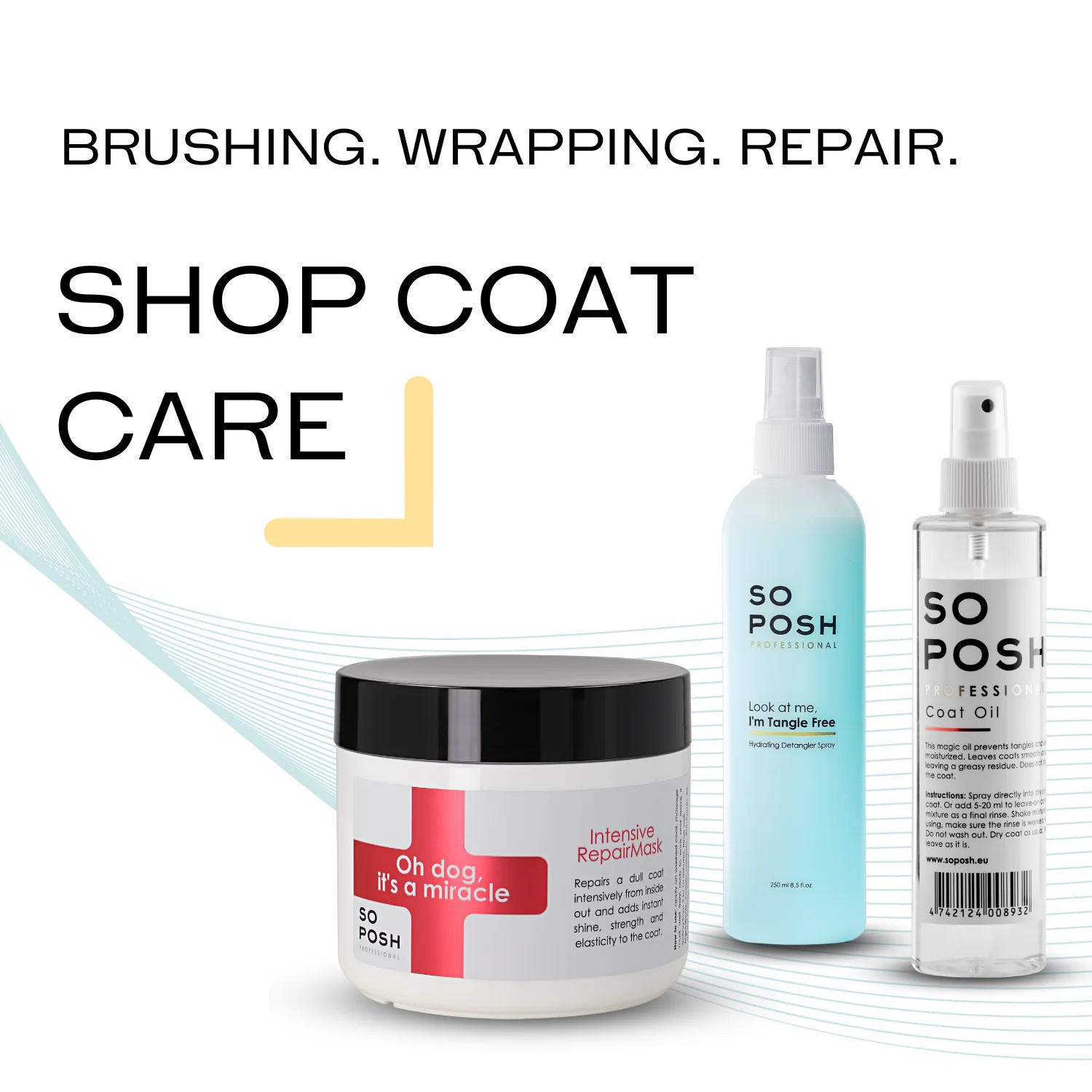 Pro hedvábně jemnou srst dejte na dlaň pár kapek Magického oleje So Posh Coat Oil, vetřete důkladně do srsti až ke kořínkům a kartáčem pročešte srst
