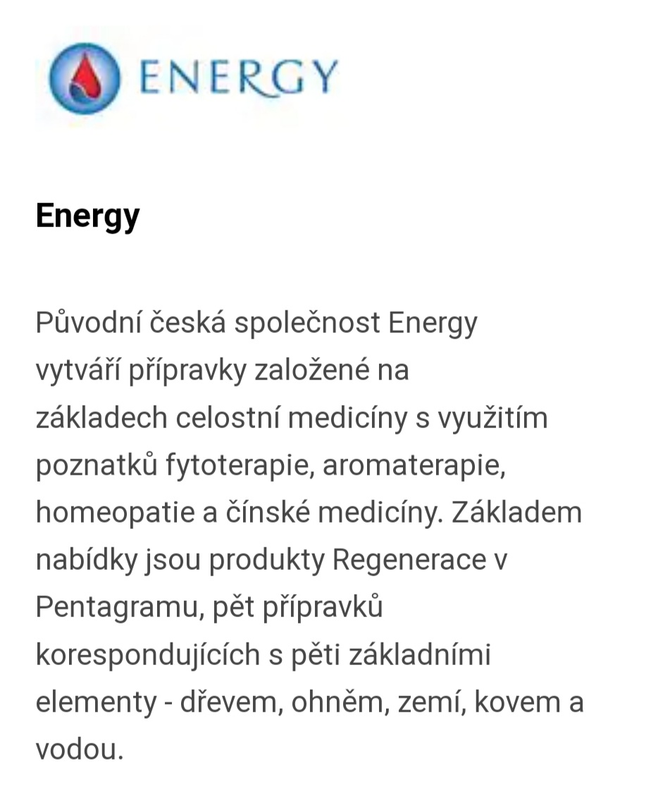 Výrobky společnosti Energy jsou vyrobeny z vysoce účinných, zaručeně přírodních produktů, sestavených podle principů staré čínské medicíny, avšak s využitím nejnovějších poznatků fytoterapie, homeopatie, krystaloterapie a biorezonance. Prostřednictvím vlastního výzkumu zaručuje značka Energy zákazníkům co možná nejkvalitnější a nejčistší výrobní postupy a v tomto směru se již dnes řadí ke světové špičce. Po ošetření těmito produkty je pleť dobře zásobena kyslíkem a pestrou paletou minerálů, vitaminů a celou řadou biologických látek se silným regeneračním a vitalizujícím účinkem na buňky kůže