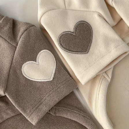 - s efektními nášivkami na rukávech se vzorem srdíčka
