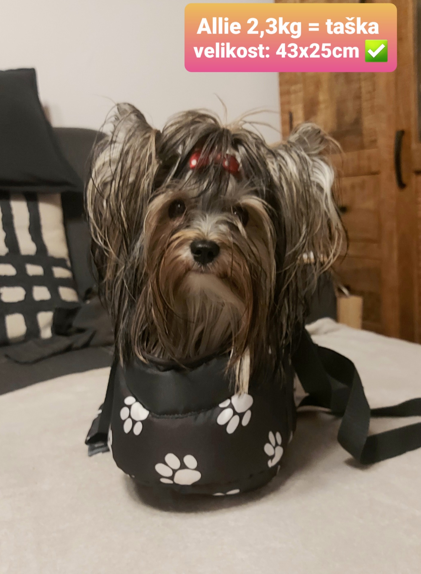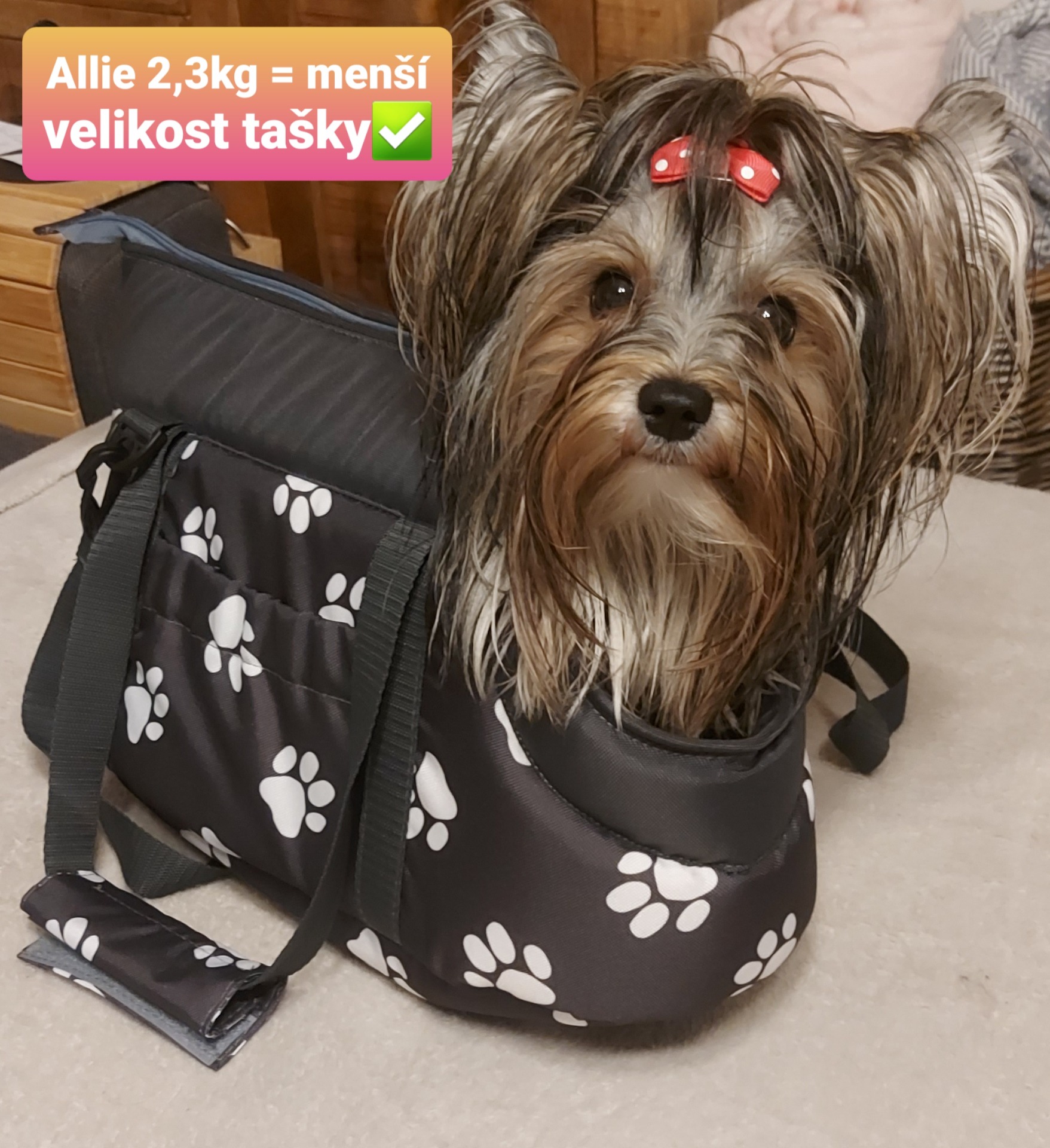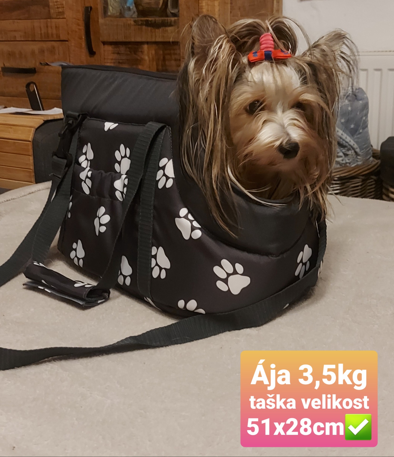 Taška je vhodná pro psy a štěňata od hmotnosti cca 0,5 kg do 3,2 kg