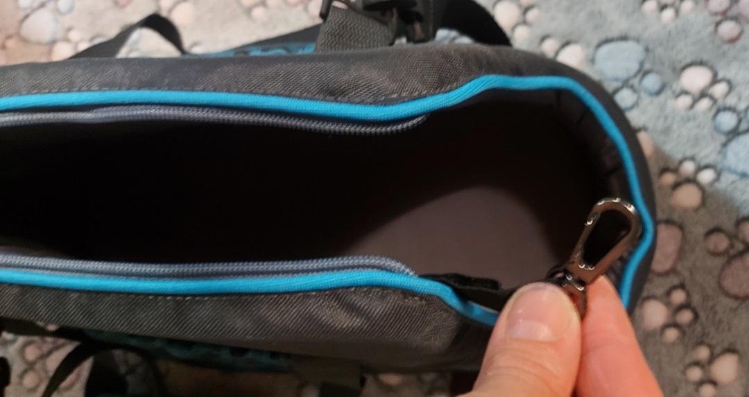 Taška je vybavena karabinou na připnutí pejska, aby nevyskočil