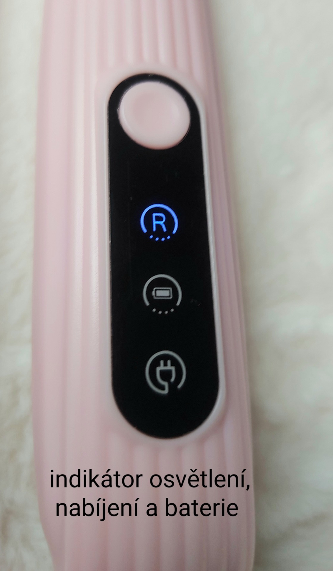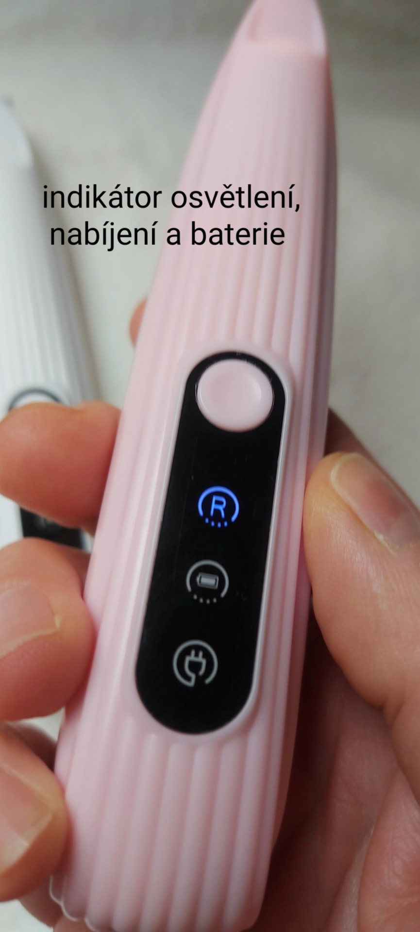 Přímo na těle zastřihovače je umístěna indikační plocha s LED indikátory provozu, baterie a nabíjení
