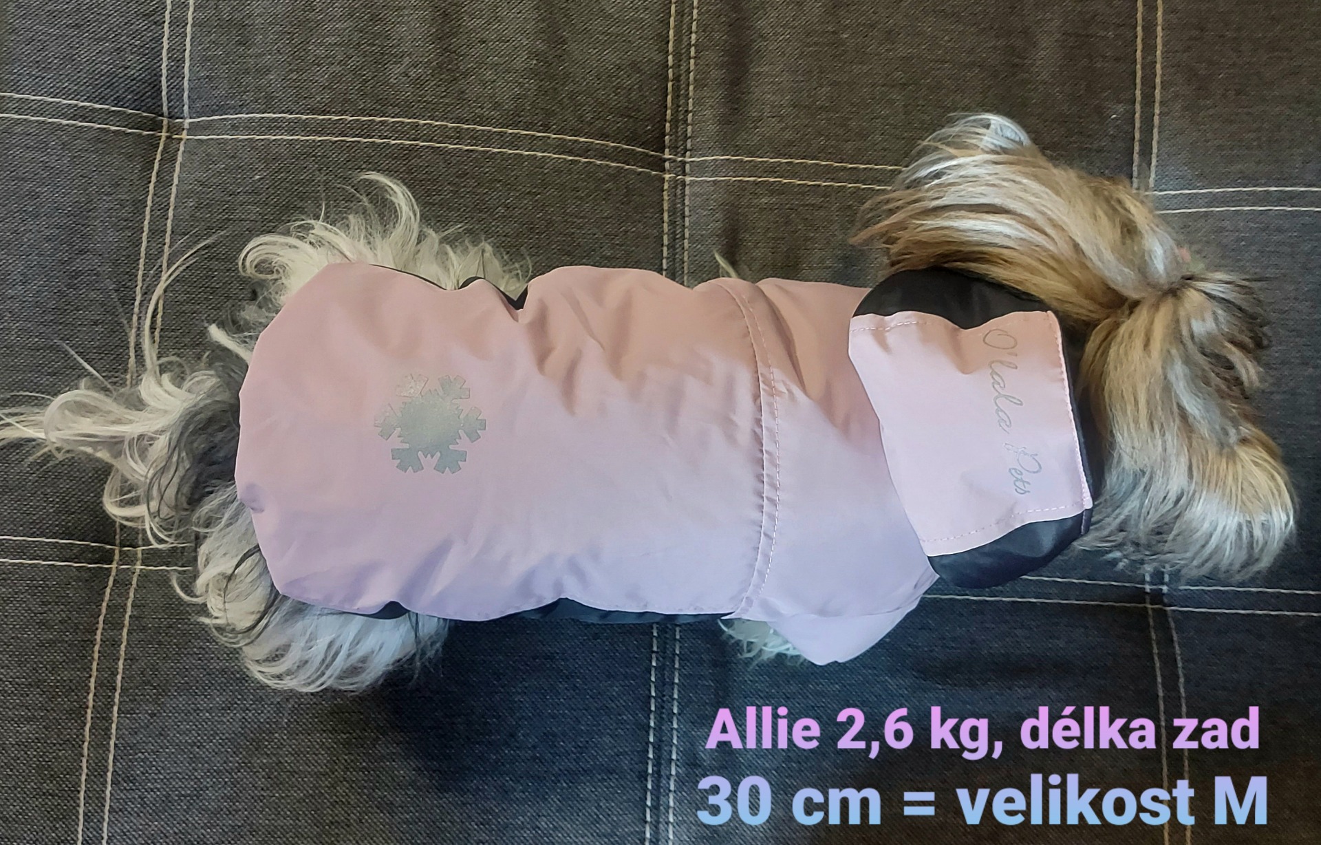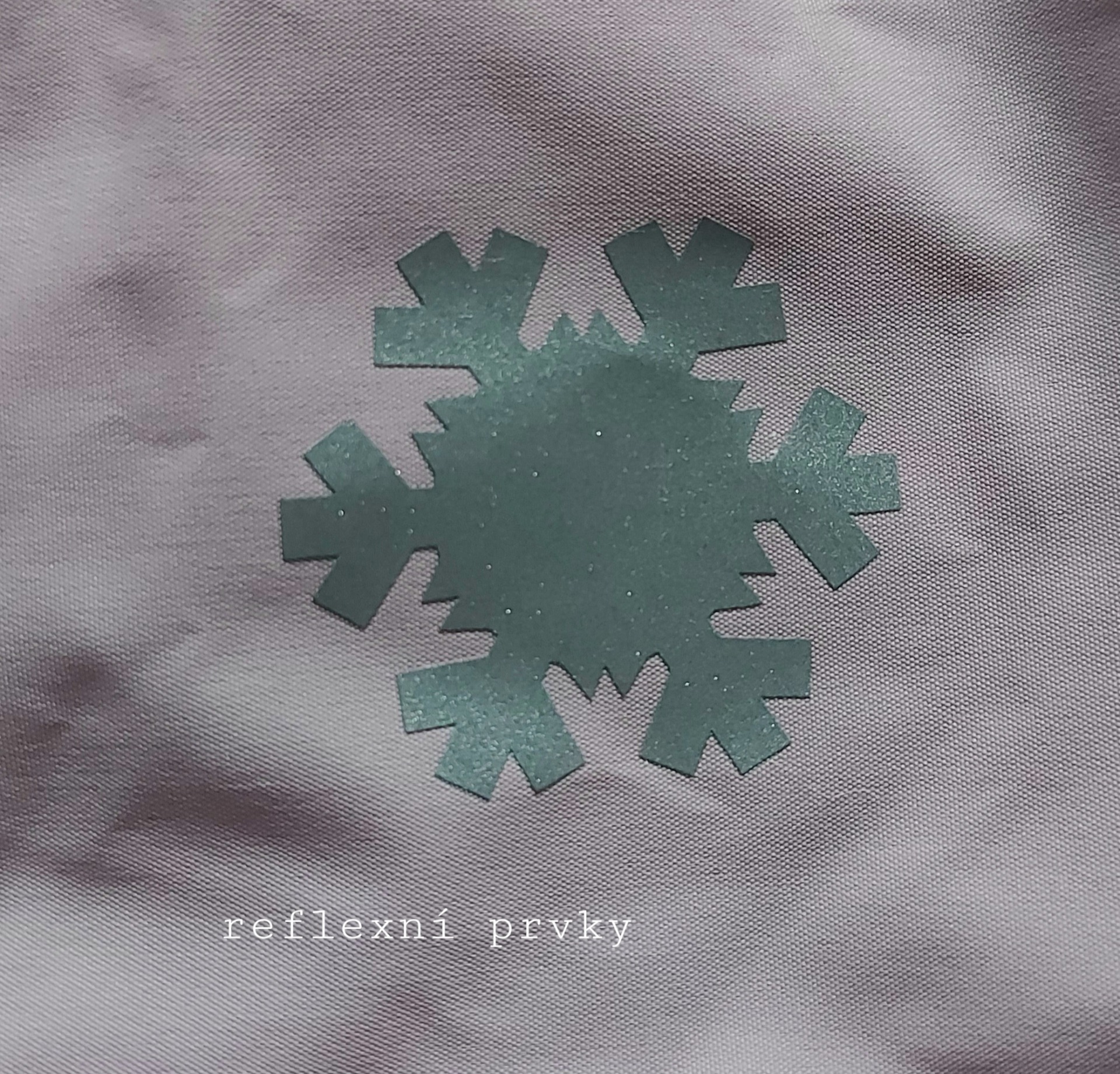 Na bundě na zádech je REFLEXNÍ výšivka vločky, na kapuci reflexní výšivka Ó lala Pets