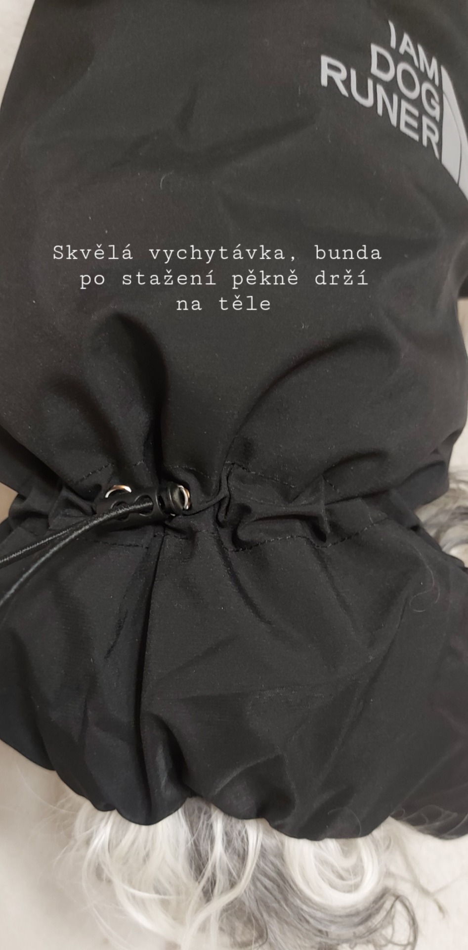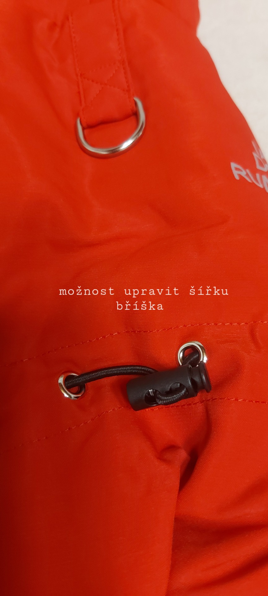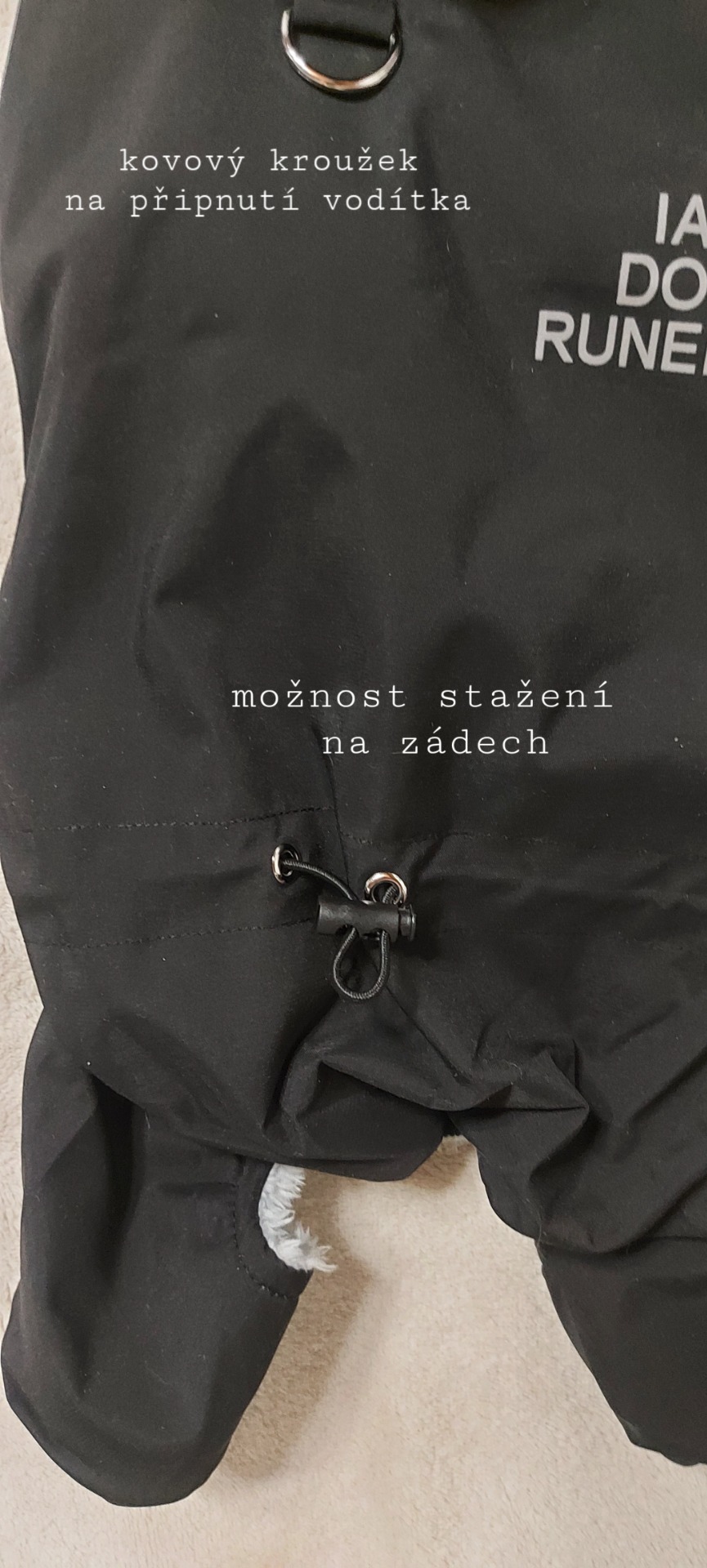 Přes hrudník lze kombinézu stáhnout na zádech gumičkou = dobře drží na těle psa