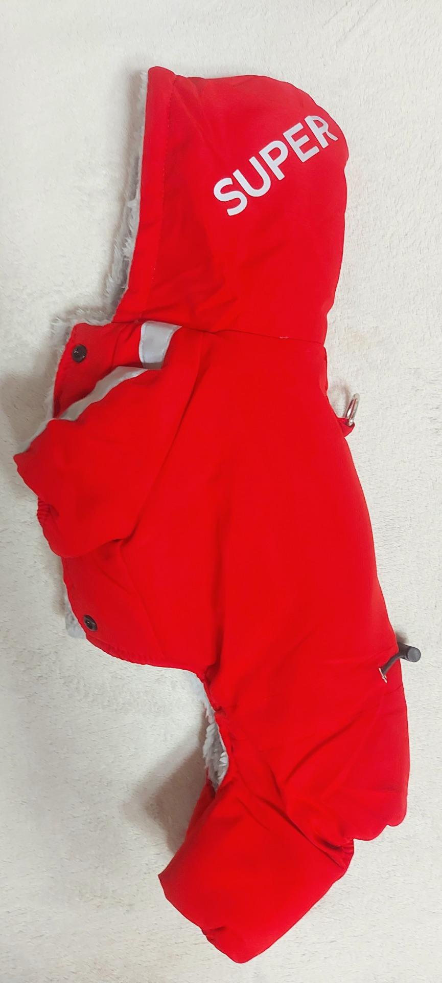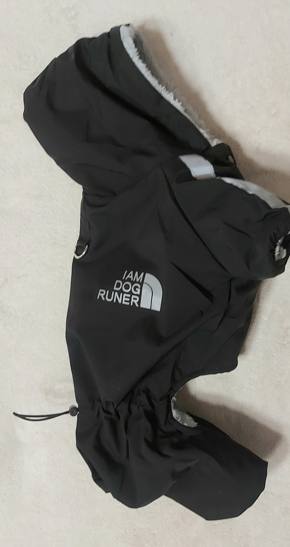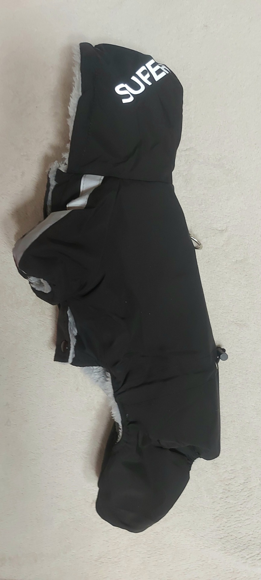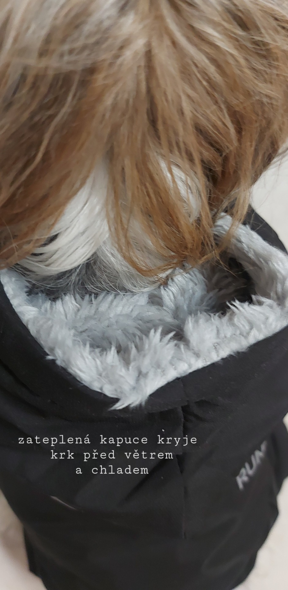 Kapuce je uvnitř zateplená, kryje krk psa před chladem i mrazem