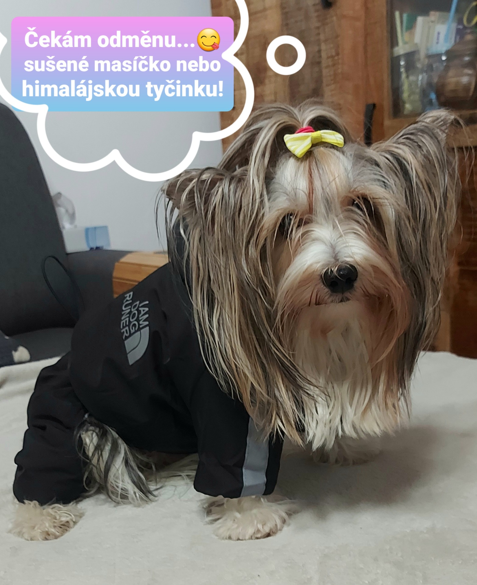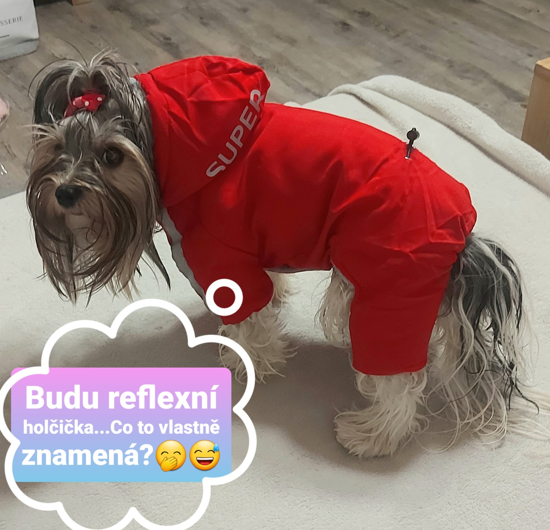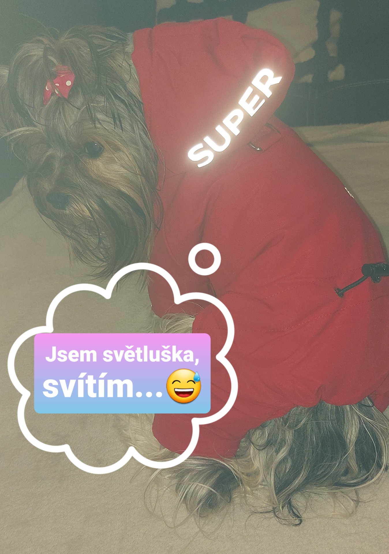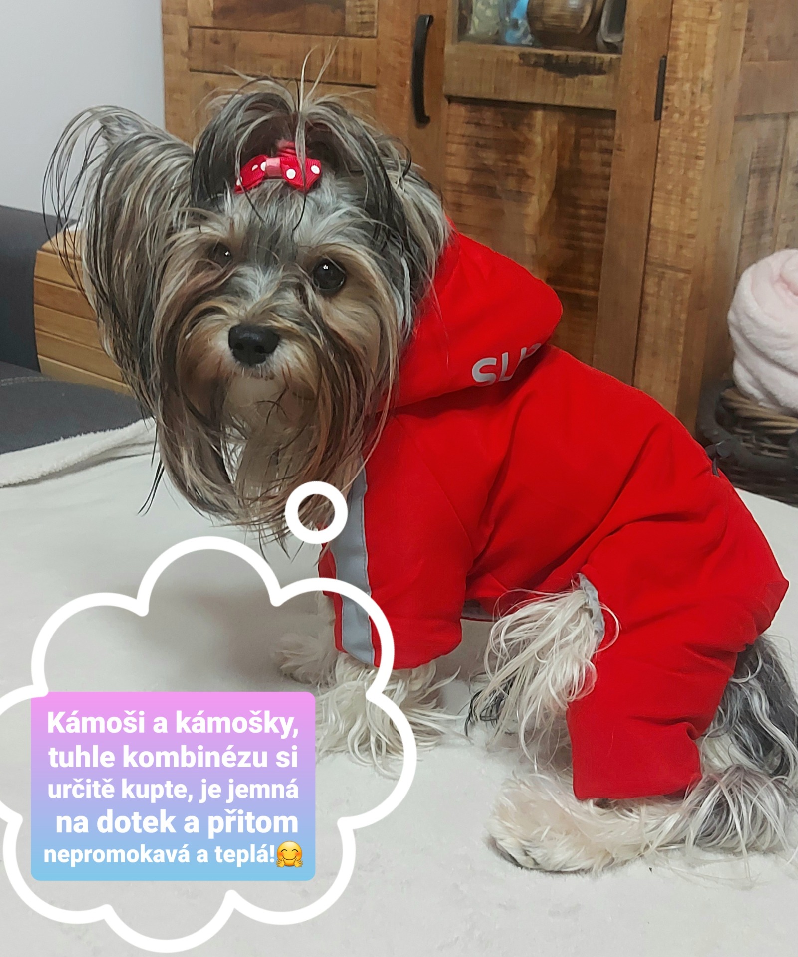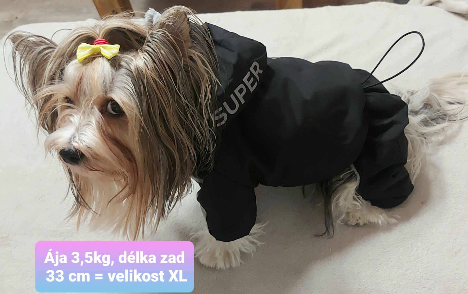 Pokud si nejste jisti správnou velikostí, kontaktujte mne, ráda Vám poradím, pomůžu a zašlu foto našich jorkšírských teriérů v tomto oblečení