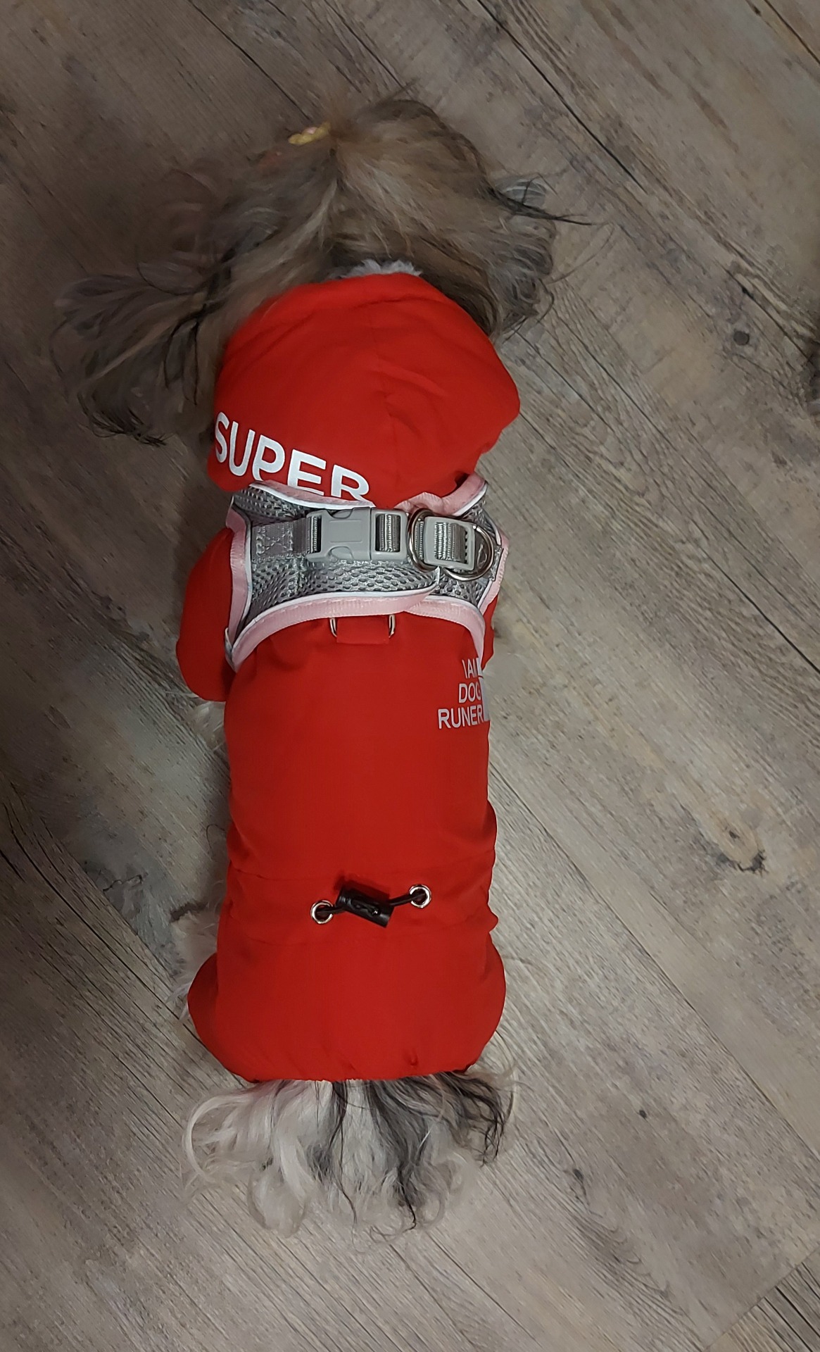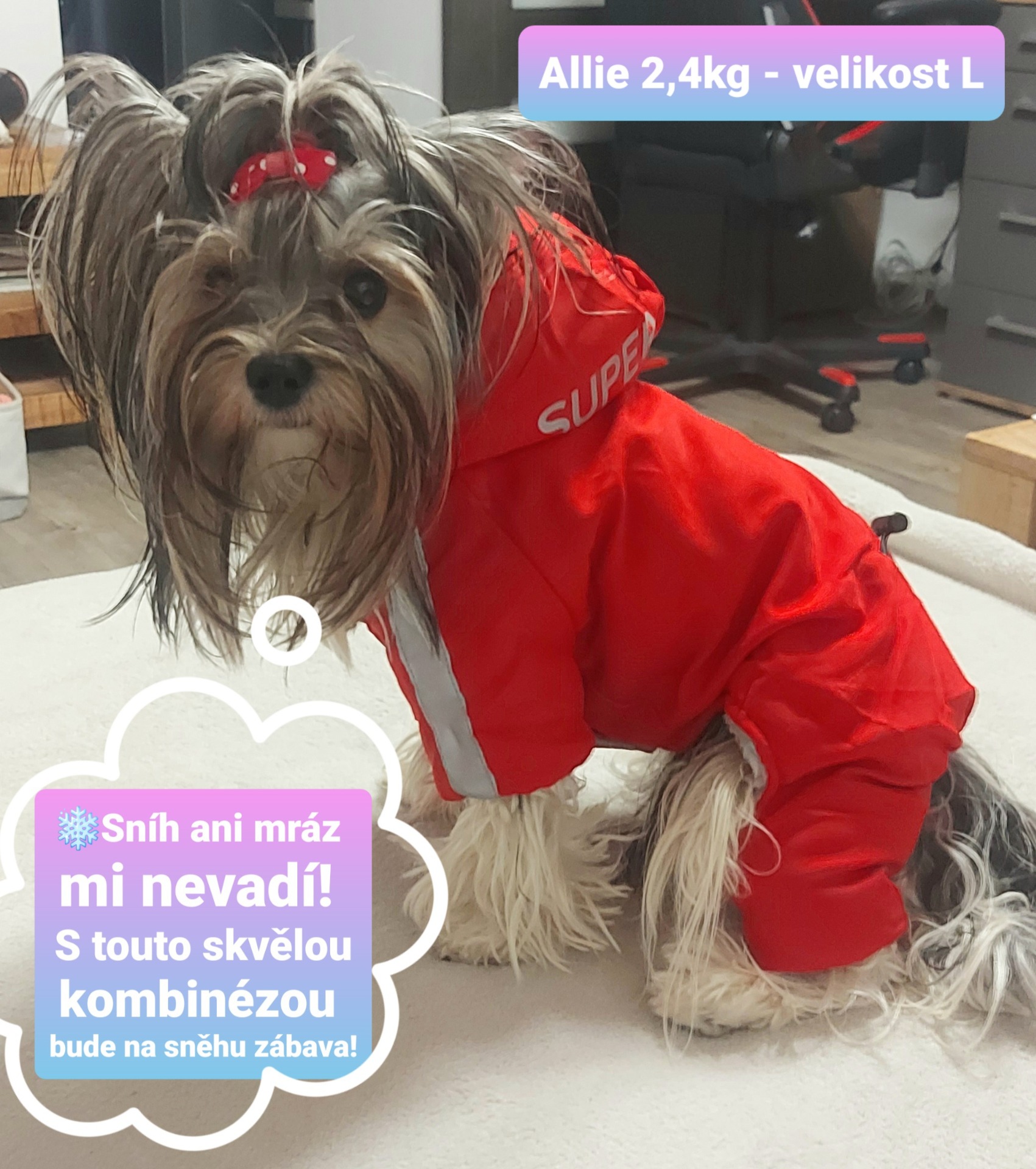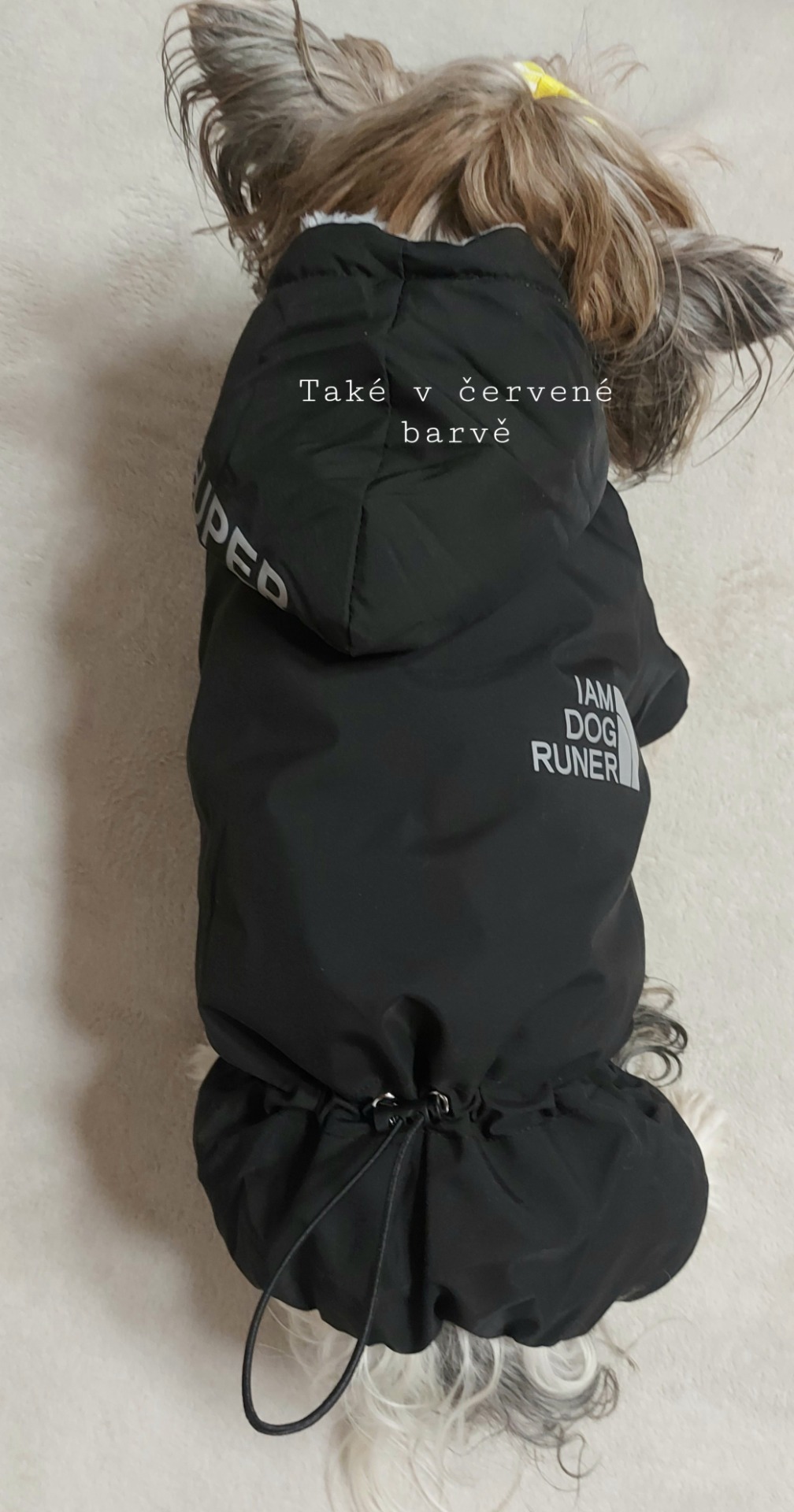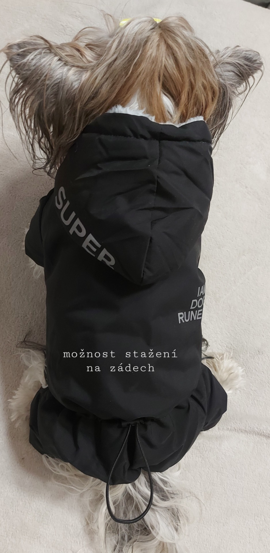 Tato kombinéza je velmi kvalitně zpracovaná, velikost L obleče pohodlně i naše jorkšírka Allie, která má 2,4 kg a délku zad 30 cm - fotogalerie