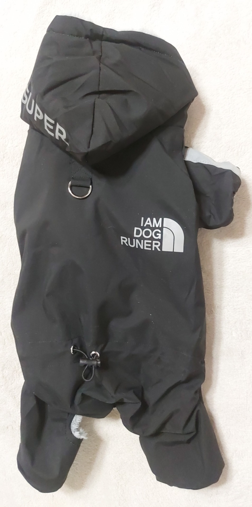 Kombinéza je nepromokavá, vhodná do mrazu, deště i mokrého sněhu, kryje všechny nohy psa