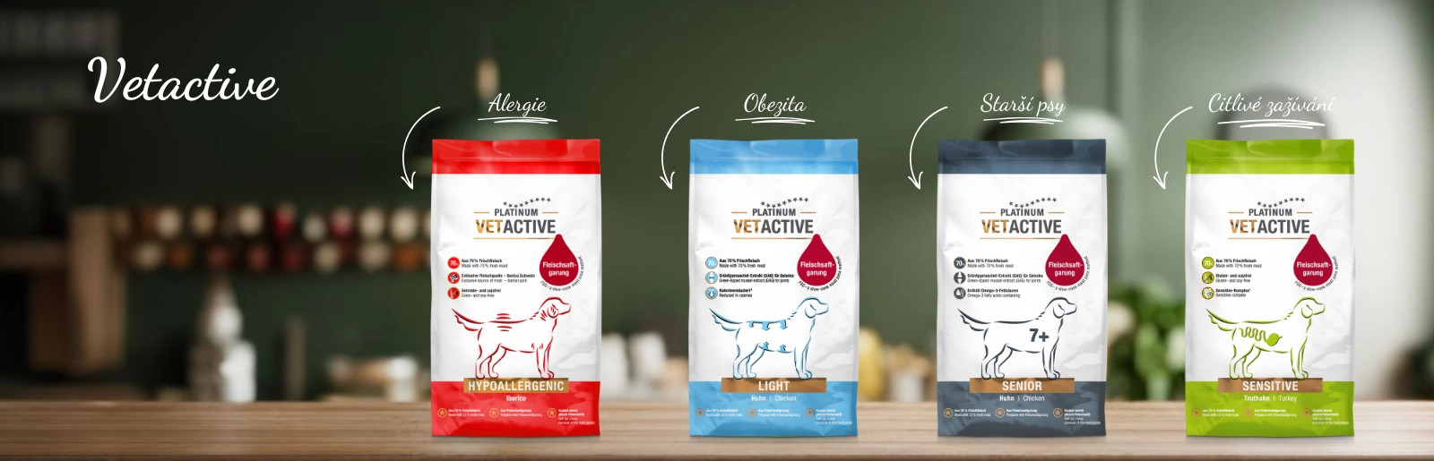 Veterinární krmivo VETACTIVE bylo vyvinuto ve spolupráci s veterináři a odborníky na výživu psů. Mnoho psů dnes trpí lidskými neduhami - nadváhou, problémy se slinivkou břišní, potravinovými alergiemi, kožními potížemi, zažívacími problémy a dalšími. Krmivo pro psy je připraveno metodou Fleischsaftgarung (FSG), proto je tak lahodné a poloměkké. Kvalitní a chutné krmivo můžete dopřát každému psovi, protože i dieta může být chutná.